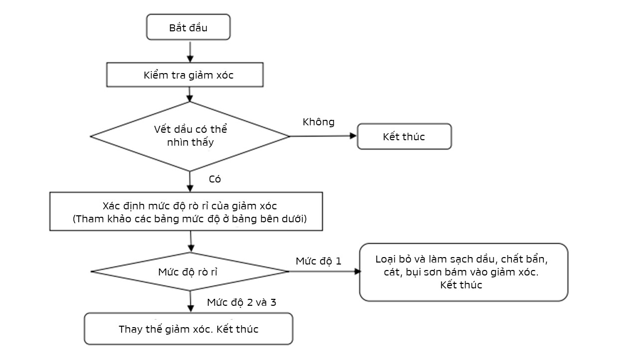 Dưới đây là quy trình hướng dẫn nhằm đánh giá rò rỉ dầu của giảm xóc. Quý khách hàng vui lòng tham khảo hướng dẫn kiểm tra giảm xóc và xác định mức độ của vết dầu (nếu có).